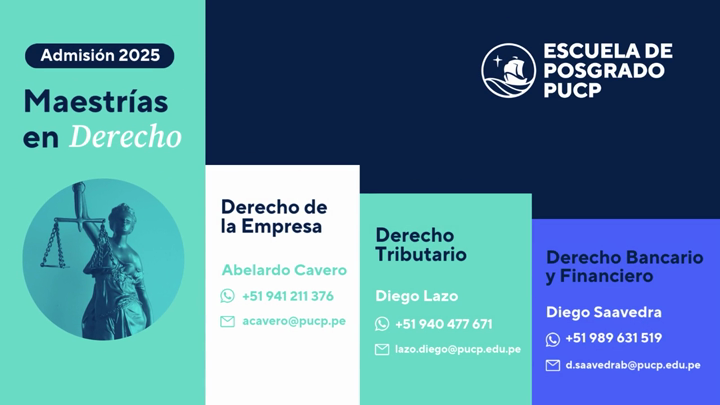 El área Derecho y Empresa está conformada por las maestrías en Derecho Tributario, Derecho Bancario y Financiero y Derecho de la Empresa (presencial, semipresencial y con menciones en Gestión Empresarial y en Responsabilidad Social).